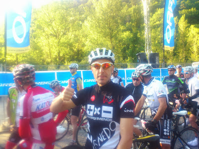 A las 08:30 tomamos la salida,ya con una temperatura muy agradable, calentada tambíen por el formidable ambiente que se respiraba. Discurso de las autoridades y cohete para tomar la salida, encabezada por tres ciclista del Euskaltel. Venga, un grupete y a por el primer puerto (así sin calentar ni na), las sensaciones muy buenas y decido tirar a por el grupo de adelante. Tras una ligera bajada nos disponemos a subir Larrau (puerto mïtico de los pirineos). La bajada muy peligrosa por la gravilla, seguida de unos kilómetros de buenas carreteras llanas con algún repechillo. Me encuentro muy bien y tirando del grupo, jijiji. ¡PINCHAZO! Ala, a parar y reparar. A por el siguiente puerto Cul de Lie, de tres km pero que tres km ¡la ostia!, un par de km de bajada para recuperar y a por el último puerto Lapierre de St Martín, no sé cuantos km de subia porque se descentro el cuentakilómetros en el pinchazo, pero por lo que se oía a parte de juramentos por el calor,era que tenía 25 km de subida. Una vez coronado en las pistas de esquí de Arette, 25 km de bajada con buena carretera para disfrutarla y 10 km de llano para llegar a meta, con un tiempo de 5h 26’ .